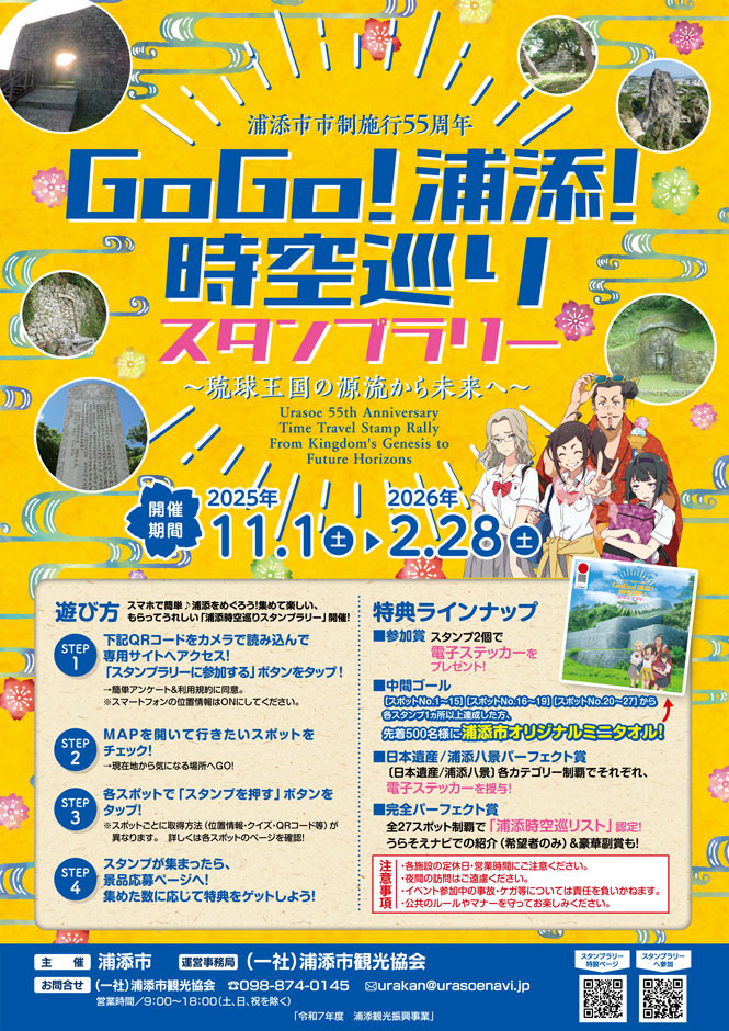「浦添市市制施行55周年 GoGo! 浦添! 時空巡りスタンプラリー~琉球王国の源流から未来へ~」 は、スマートフォンを活用して市内の歴史・文化・自然・道中のショッピング・体験など多彩なスポットを巡り、スタンプを集めながら浦添の魅力を再発見できるデジタル周遊イベントです。