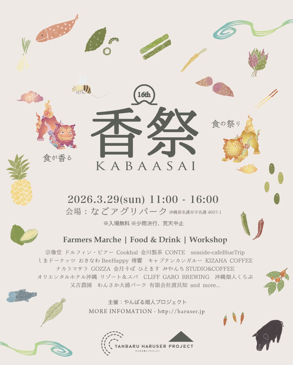 フードフェスを開催します。県内飲食店よるやんばる食材を使ったフードやドリンク販売、畑人の採れたて野菜販売、ステージイベントのほか、ワークショップなど、子どもも大人も楽しめるイベントです。ぜひお越しください。