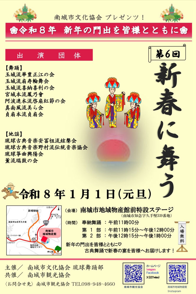 2026年が素敵な1年となるよう夢と希望を込め、南城市文化協会の琉球舞踊部による琉球舞踊で新年の幕開けを華やかに彩ります。