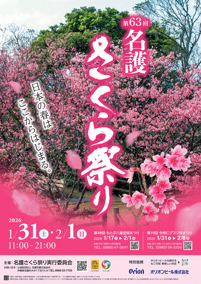北部からゆっくりと南へ広がる桜前線は、島に春の訪れを告げる合図。名護、本部、今帰仁をはじめ、各地で桜まつりが開かれ、城跡や海を背景に咲く“沖縄ならではの桜景色”が旅人を迎えます。ひと足早い春を探しに、色鮮やかな桜の道へ出かけてみませんか。