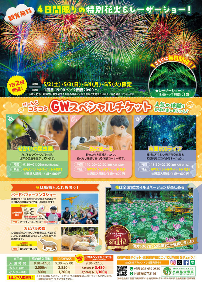 4日間限定の花火&レーザーショーに加え、「せかいの昆虫展」や「あにま〜る」、イルミネーション1位の「南国ECOライツ」まで全部楽しめるGW限定チケットが登場!