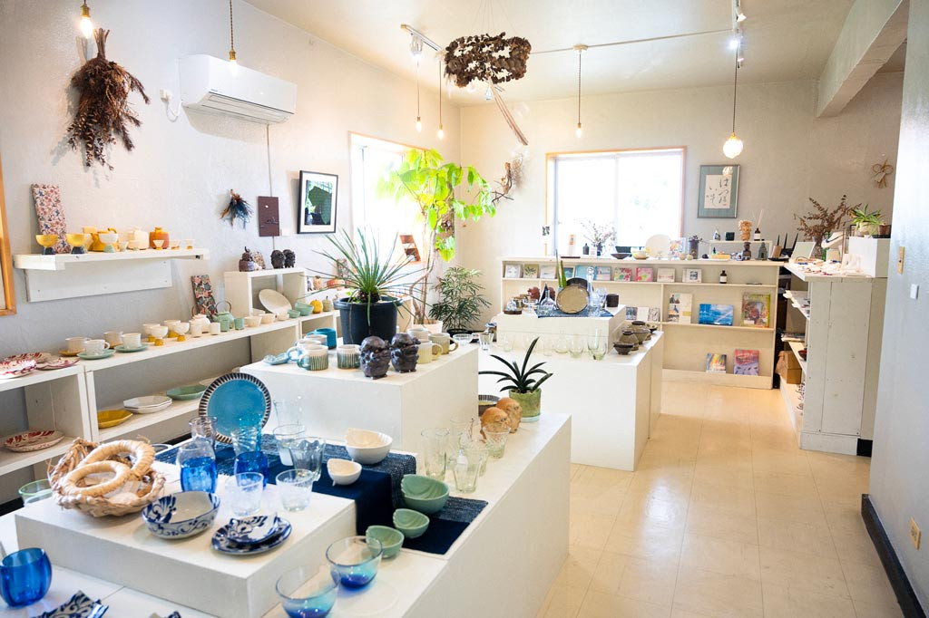 うるま市石川署の海が見える外人住宅で出会える、地域で作られているとっておきの沖縄現代工芸(琉球藍染め織物、紅型、琉球ガラス、やちむん)が集まっている。