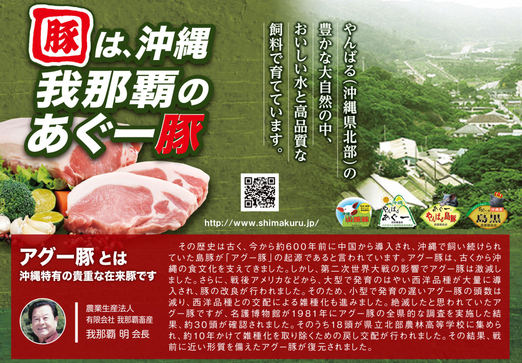 琉球在来豚アグーの血統を100%受け継いだ豚肉。特に脂身が白く、締まりのある肉質が主な特徴。餌は麦を主体に天然カルシウムの与那国産化石サンゴ、糖蜜、ビール酵母、泡盛の酒かすなどを配合しています。通常の飼料に比べ費用はかかりますが豚の健康を第一に考えています。