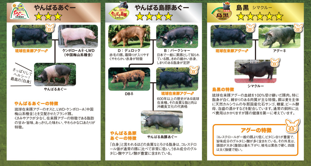 琉球在来豚アグーのオスと、LWD・ケンボローA(中国梅山系種含)とを交配させたブランド豚。くさみやアクが少なく、在来豚アグーの特徴である脂肪の甘み・旨味、あっさりした味わい、やわらかな口あたりが特徴。