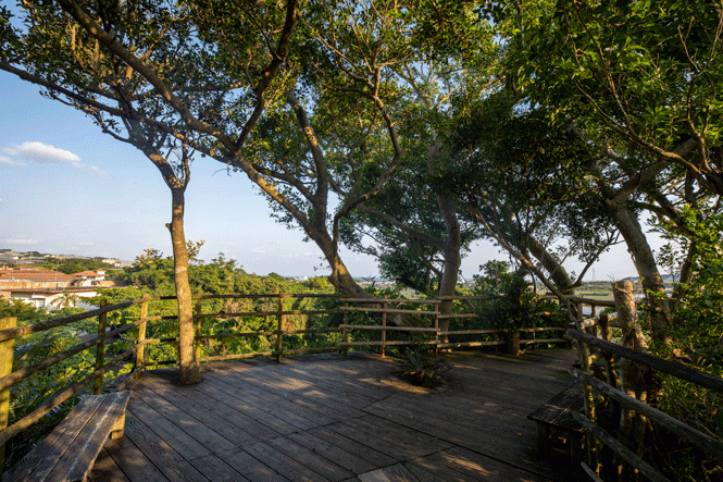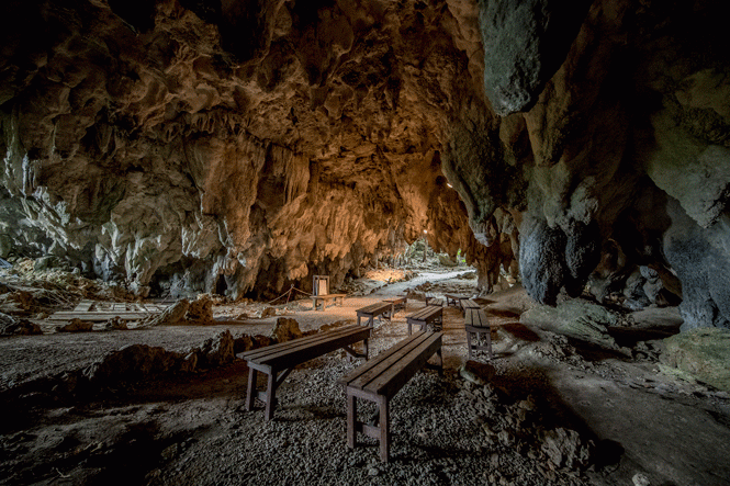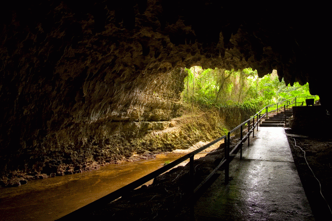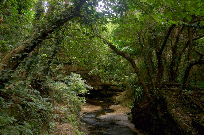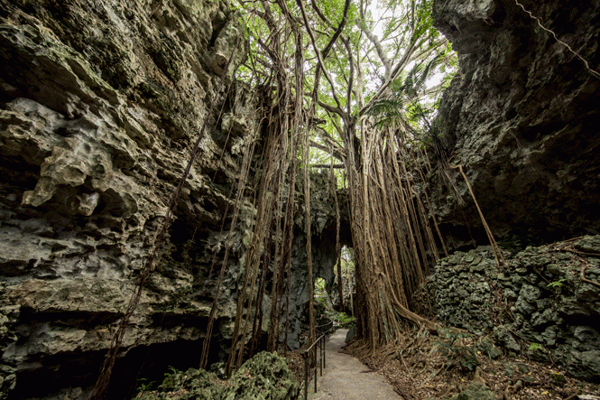 数十万年前の鍾乳洞が崩落してできた谷間に広がる森。