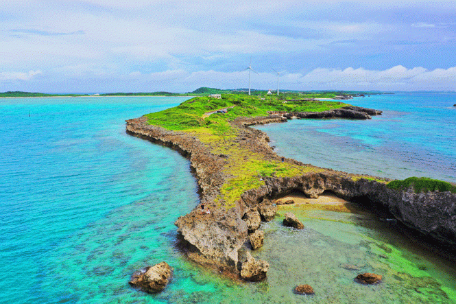 風車が回る最北端の岬で、池間大橋を望む絶景