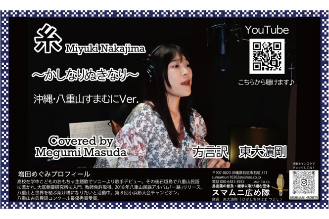 高校在学中こどものおもちゃ主題歌でソニーより歌手デビュー。その後石垣島で八重山民謡に惹かれ、大底朝要研究所に入門。教師免許取得。2018年八重山民謡アルバム「一路」リリース。八重山と世界を結ぶ懸け橋になりたいと活動中。第8回小浜節大会チャンピョン。八重山古典民謡コンクール最優秀賞受賞。