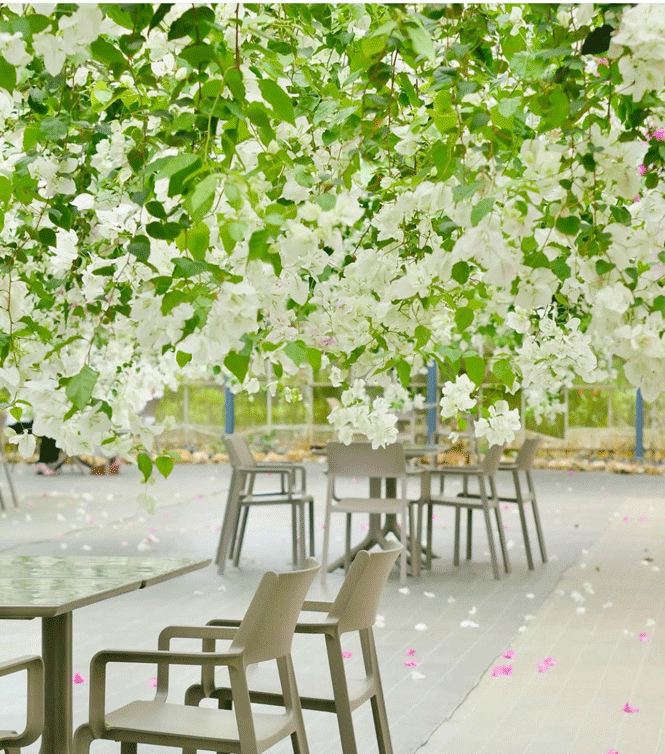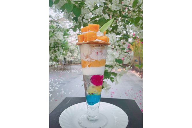 降りそそぐブーゲンビレアを眺めながら、 宮古島マンゴースイーツはいかがですか?