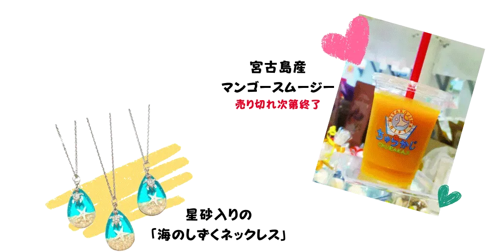 宮古島の名産品から美しい海を表現したオリジナル雑貨やアクセサリーまで、様々な商品をご用意しております。